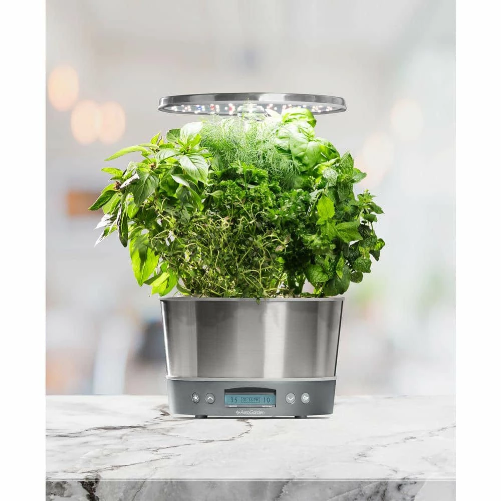 Why wait for the perfect weather to have a great gardening day? Meet the AeroGarden Harvest Elite 360, a sleek, stainless steel hydroponic garden that grows up to 6 of your favorite herbs, veggies, or flowers year-round – no sun, soil, or green thumb required. The indoor garden’s grow light hood contains 20W of white, red, and blue LED lights, giving your plants the full spectrum of light they need to grow quickly – up to 5x faster than in soil. The Harvest Elite 360 is round, compact, and adjusts for up to 12″ of grow height. Its automatic timer makes sure the lights go on and off at exactly the right time, and the digital display and illuminated push button controls tell you when to add water and plant food. Throw in vacation mode and you’ve got one of the most advanced indoor gardens ever. The AeroGarden Harvest Elite 360 looks great anywhere – kitchen, office, you name it. Not to mention, the included Gourmet Herbs Seed Pod Kit, featuring Genovese Basil, Curly Parsley, Dill, Thyme, Thai Basil, and Mint, lets you keep the fresh flavors of summer all year long.
