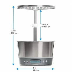 - Adjusts for up to 12″ of grow height, has a sleek, stainless-steel finish, and is round in shape