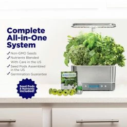 Why wait for the perfect weather to have a great gardening day? Meet the AeroGarden Harvest Elite, a sleek, stainless steel hydroponic garden that grows up to 6 of your favorite herbs, veggies, or flowers year-round – no sun, soil, or green thumb required. The indoor garden’s grow light hood contains 20W of white, red, and blue LED lights, giving your plants the full spectrum of light they need to grow quickly – up to 5x faster than in soil. The Harvest Elite is compact and adjusts for up to 12″ of grow height. Its automatic timer makes sure the lights go on and off at exactly the right time, and the digital display and illuminated push button controls tell you when to add water and plant food. Throw in vacation mode and you’ve got one of the most advanced indoor gardens ever. The AeroGarden Harvest Elite looks great anywhere – kitchen, office, you name it. Not to mention, the included Gourmet Herbs Seed Pod Kit, featuring Genovese Basil, Curly Parsley, Dill, Thyme, Thai Basil, and Mint, lets you keep the fresh flavors of summer all year long.