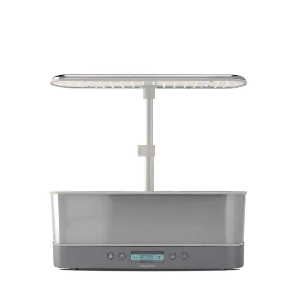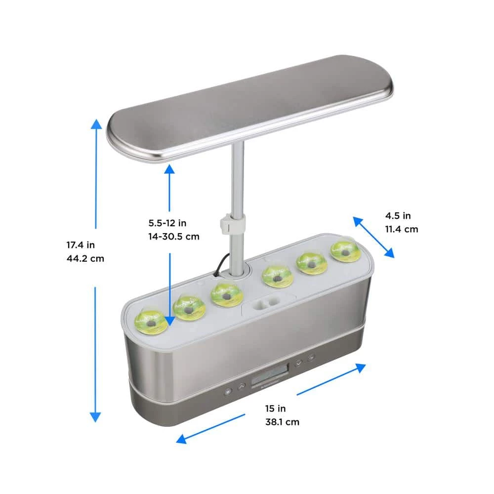 - Adjusts for up to 12″ of grow height, has a sleek, stainless-steel finish, and is only 4.5″ wide making it a great fit for limited counter space