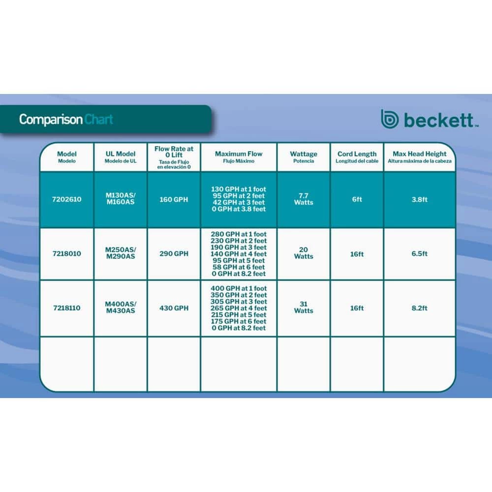 This Beckett 1/64 HP Submersible Shut-Off Fountain Pump has an adjustable valve to let you easily control or turn off the pumping action. It pumps up to 160 GPH and has a maximum lift of 36 in. This pump is great for your outdoor fountain and conveniently connects to tubing with a 1/2 in. (inner) diameter. Oil less. Flo-control built in with unlimited settings. This pump is perfect for indoor or outdoor fountains and is unique because of the auto shutoff in case your water should ever run low. Only uses 11 watts, 6 ft power cord.