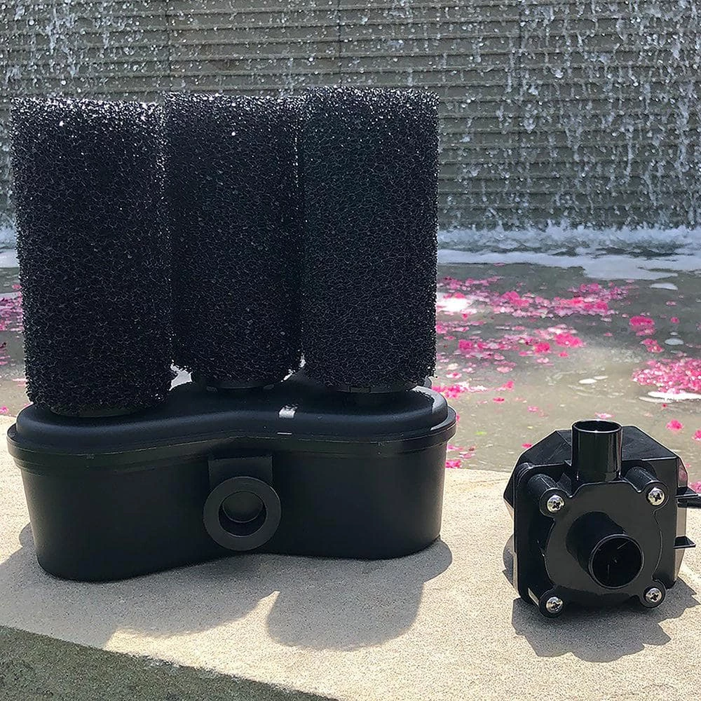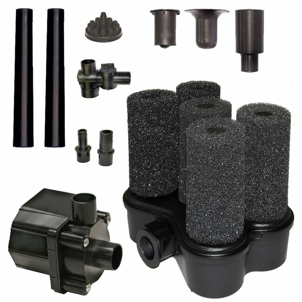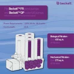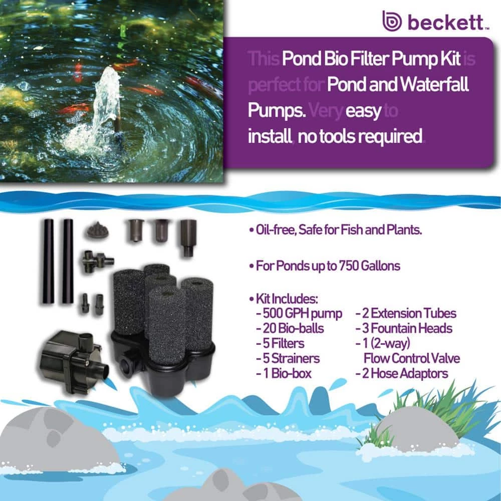 The Beckett Bio Filter 5X Kit with Pump is designed to pump up to 500 gal. per hour. This kit includes a flow control valve, 2 ext. tubes, 4 nozzles, 2 adapters and filters. The pumps come with a 15 ft. cord for the flexibility of a distant power source.