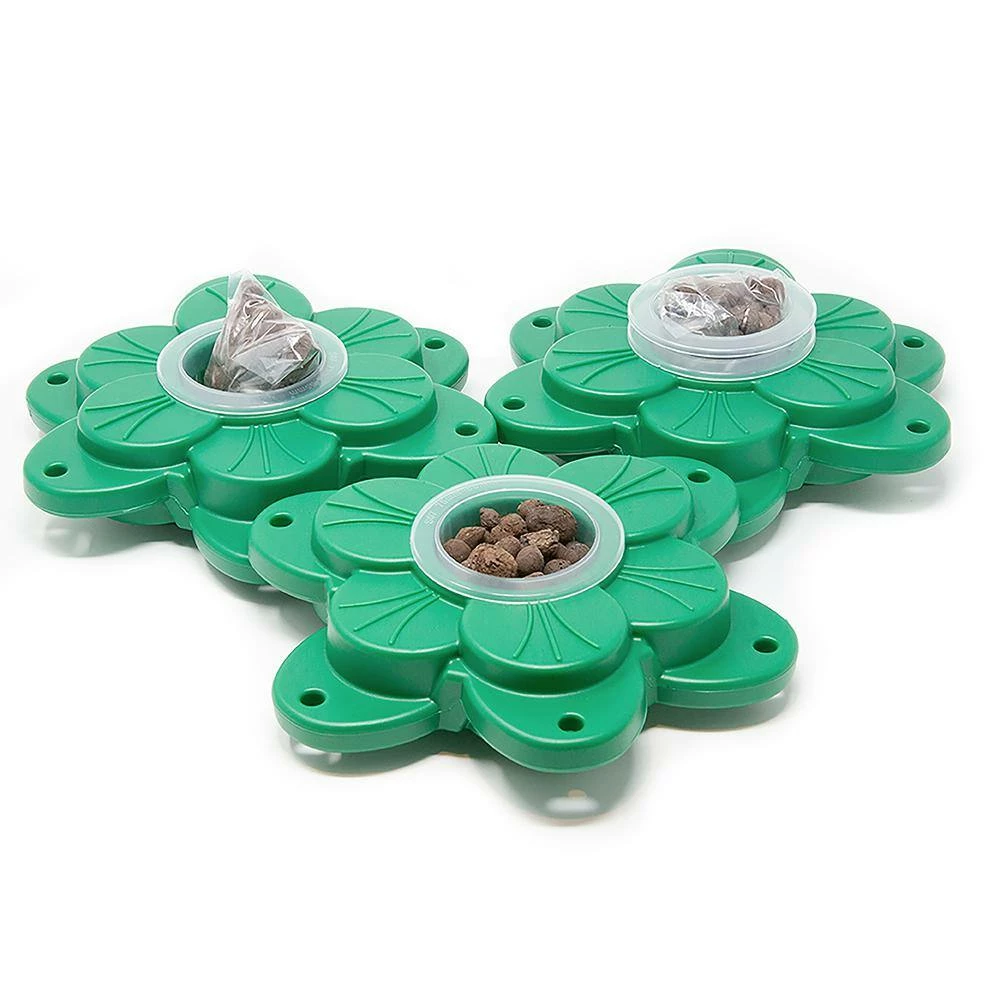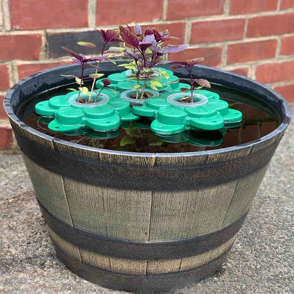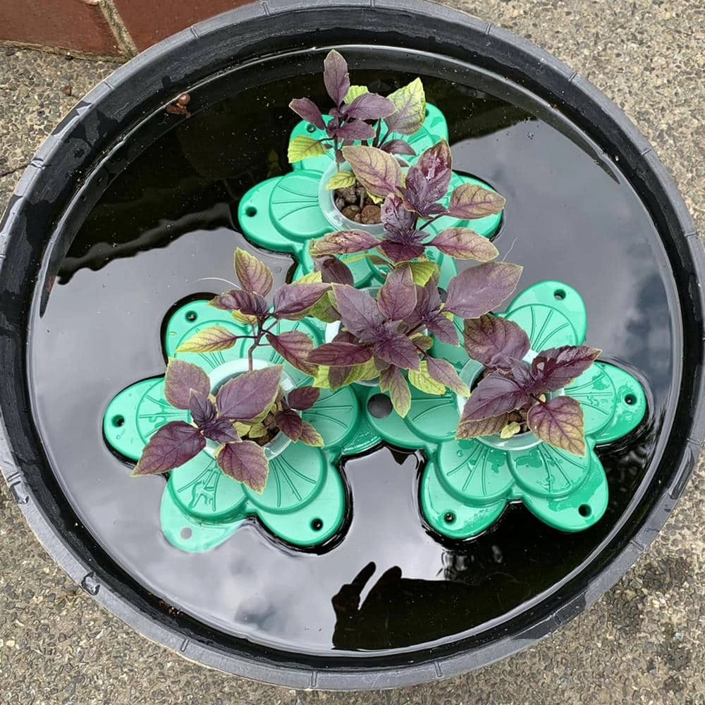 Grow herbs, vegetables and flowers using aquaponics. Aquaponics is the combination of growing fish and plants together in an integrated system. The fish create a food source for the plants. The plants naturally filter the water for the fish. Before you begin, your pond should be healthy and well established with a balance of fish and aquatic plants before introducing the grow kit. For new fish ponds, please allow 6 weeks for your pond to create a natural bio-filter cycle before introducing the grow kit. We suggest these types of seeds for beginners: leafy lettuce, arugula, pak choi, kale, spinach, swiss chard, basil, mint, chives, watercress, parsley, lemongrass, sage, oregano. You can also add flowering plants into the mix like daisies, zinnias and marigolds. Simply place the growing media in the baskets, and place the seeds (not included) on top. Trickle some of the pond water on top of the seeds. Place the floating system in the water and watch it grow.