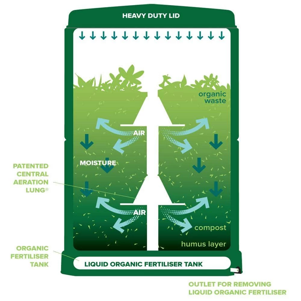 - Patented ventilation system helps create constant flowing air for quicker decomposition