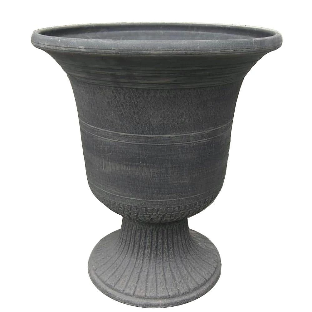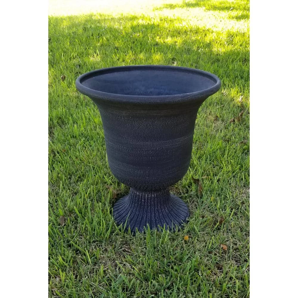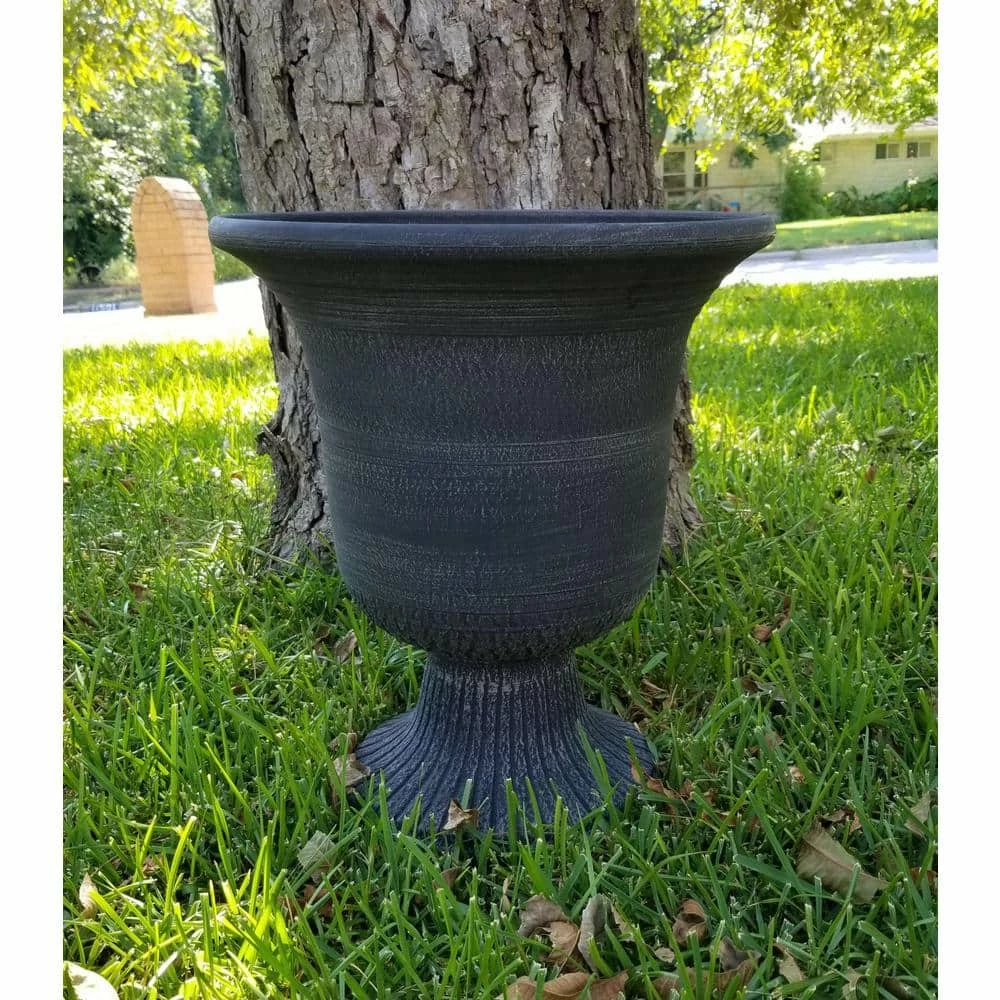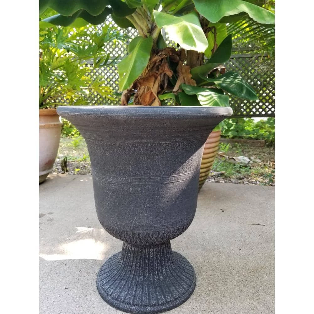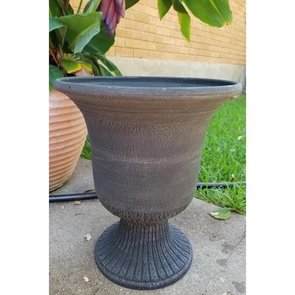 This Modena style urn planter gives your patio or garden an old world look. This 2-piece planter is easy to assemble and ready to use. Made of, a new material of pulverized clay, recycled polyester resin and non-toxic organic binder, it is stronger than traditional plastic and lightweight. The injection molding process gives uniform color throughout and adds lovely detail. Can withstand temperatures down to minus 10°F so can be left outside or brought indoors for storage.