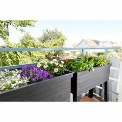 No need to worry about space limitations as the Balcony Raised Bed Planter is engineered to create a lot of growing space in compact areas. This planter features a wood textured, finished look with metal cross braces for additional strength. Special nipple attachment for use of a hose (not included) to direct drainage away from balcony.
