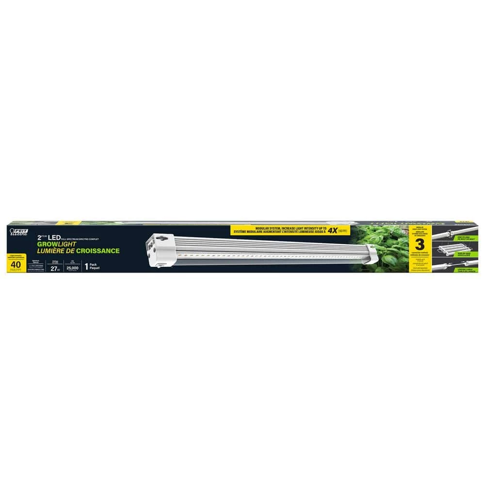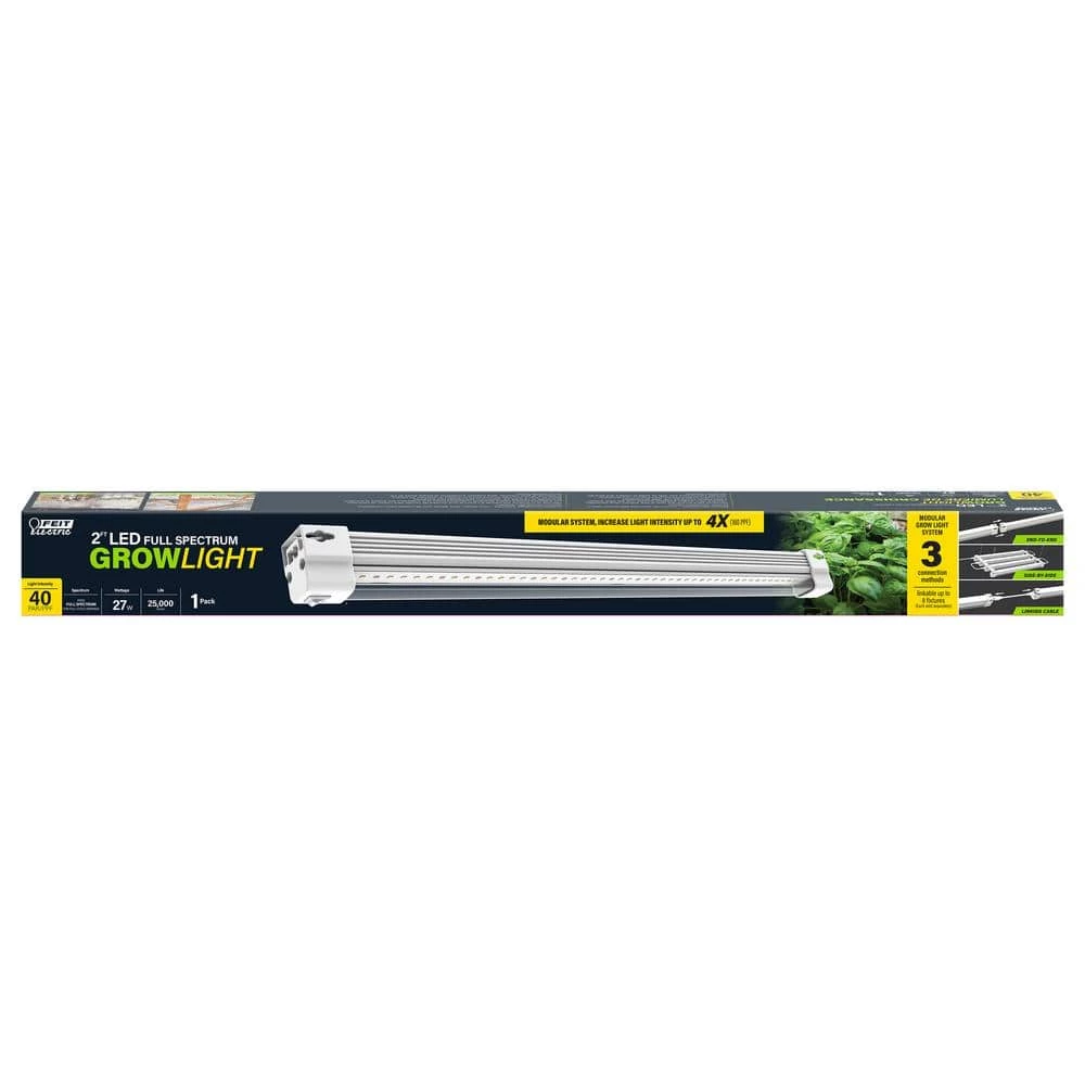 Grow better, stronger plants with the Feit Electric GLP24FS/VM/27-Watt/LED 2 ft. full spectrum grow light fixture, Rated for high humidity, this plant light is ideal for soil or hydroponic gardens, assisting all phases of indoor plant growth. Full spectrum wavelengths promote photosynthetic response, with bulbs integrated directly into the fixture taking away the chore of replacing them. Each lightweight fixture is linkable with up to eight total and comes with a 5 ft. plug in. cord and a 6 in. hanging wire harness. Our energy-efficient LED grow lights last 25,000-hours/22.8-years and put out little heat, saving your crop from burn damage. Choose a no humming, dependable grow lighting fixture for your hydroponic needs.
