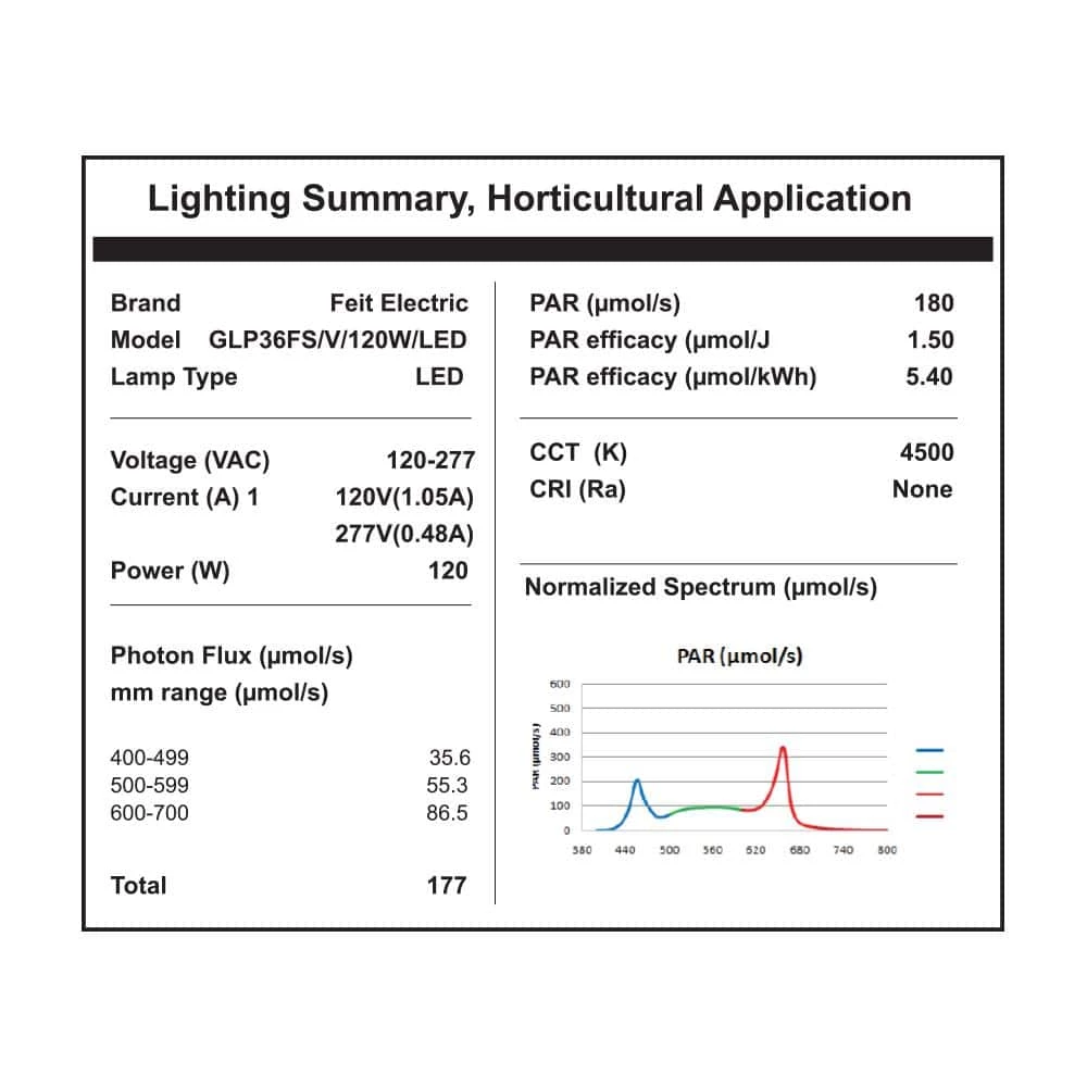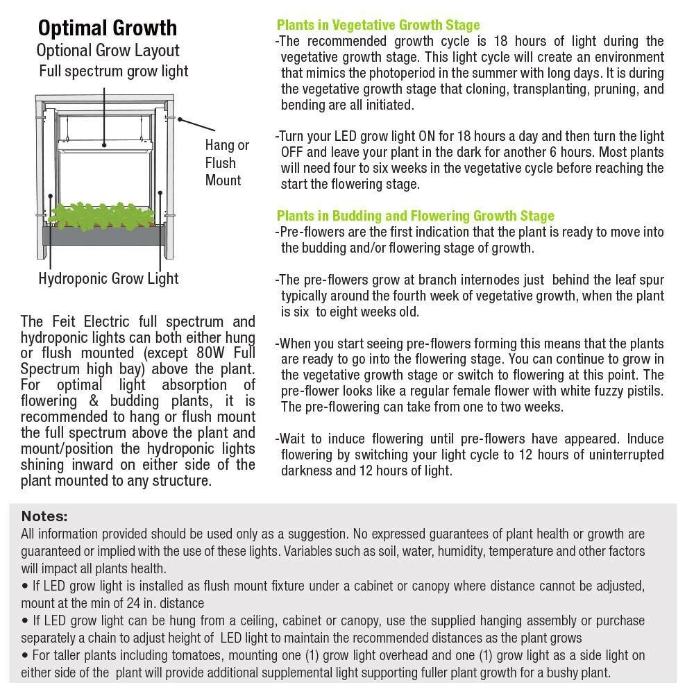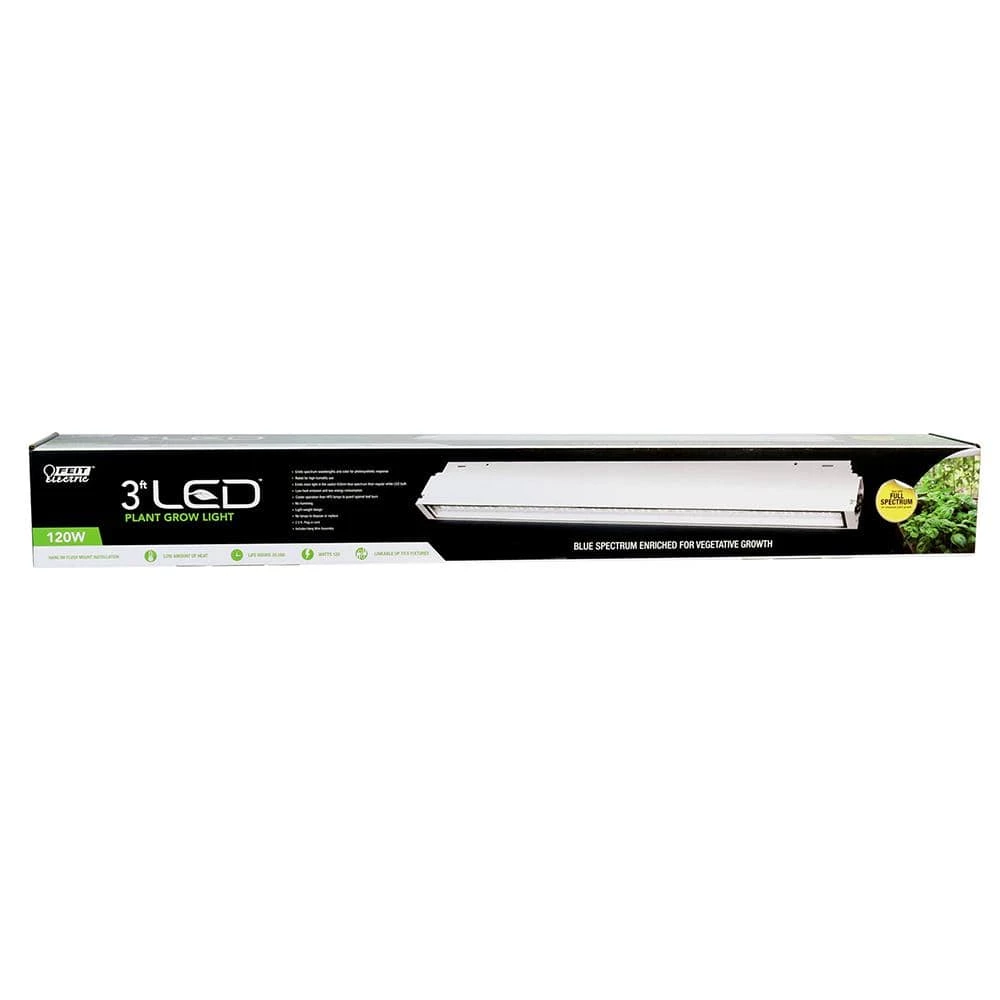 Feit Electric’s 3 ft. LED Full Spectrum blue spectrum Grow Light uses 120-Watt and comes fully assembled to be hung or flush mounted vertically on racking installation. This no-humming LED emits precise wavelengths and color for superior photosynthetic response in the 450nm blue spectrum preferred for vegetative growth. There are no lamps to dispose of or replace with this 3 ft. vertical grow light and with its cool operation it prevents burning of leaves compared to high pressure sodium lamps. includes all the parts and instructions needed for either hanging or flush mount with clamp installation on a rack. Save time, space and money with Feit Electrics LED growing eco system. Our grow light has a IP65 rating and a durable aluminum housing which protects our grow lights from direct exposure to water and dust and makes them suitable to be used outdoors. Our long lasting 35,000 hour grow lights will cut down the costs and time spent of replacing incandescent and fluorescent lamps while also providing energy saving LED light.