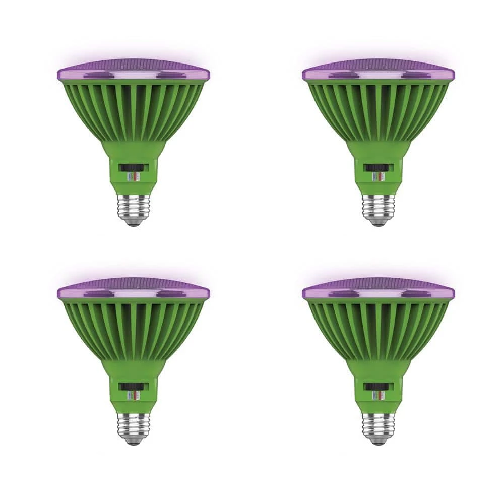 The Feit Electric 30-watt PAR38 adjustable spectrum LED grow light bulb features three light spectrum options and produces considerably less heat that retains moisture in plants while preventing lamp burn. Preset the preferred light spectrum using the switch on the bulb or use an existing standard wall switch to toggle between the three available spectrum options. Get started with a blue spectrum that takes plants from seeds to seedlings, get growing with a full spectrum for vegetative growth, and get blooming with a red spectrum to nourish plants to a flowering and fruiting stage. It contains three light intensities of 43 PAR/PPF at the blue spectrum, 41 PAR/PPF at the full spectrum, and 39 PAR/PPF at the red spectrum. The PAR38ADJGRW/LED/HDRP bulb emits 2200 lumens, and the estimated energy cost is only $3.61 per year. With an average life span of up to 25,000/22.8 years, this bulb lasts longer than traditional grow lights, saving you replacement costs and time. This LED grow light bulb has a 40° beam angle making it perfect for use in table lamps, pendants, or other open fixtures with medium E26 sockets. It is rated for high humidity use making it compatible with most hydroponic systems. This versatile grow light is also ideal for indoor gardening, organic growing, and hanging over plants. It is UL/CUL listed and FCC complaint. Get access to pesticide-free fruits and vegetables any time of the year right at home with the Feit Electric adjustable PAR38 LED grow light.