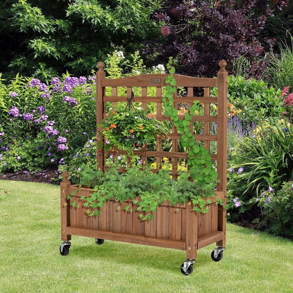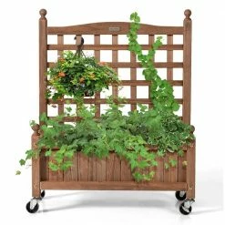 Our planters are made from high quality fir wood, 100% natural material. 6.5 in. D is enough to hold 66 lbs. of soil to grow fruits, flowers, or vegetables. The Planter trellis can be hung with plants up to 11 lbs. and can accommodate some vines. Nails are inserted into every joint to keep the trellis from becoming deformed. The water drainage hole at the bottom of the Planter bed give the plants a better environment to grow and prevent root rot. The lock wheel at the bottom allows the planter to move more easily and can be placed outdoors in sunny days or indoors in bad weather. If you are a gardening enthusiast, you must not miss this planter.