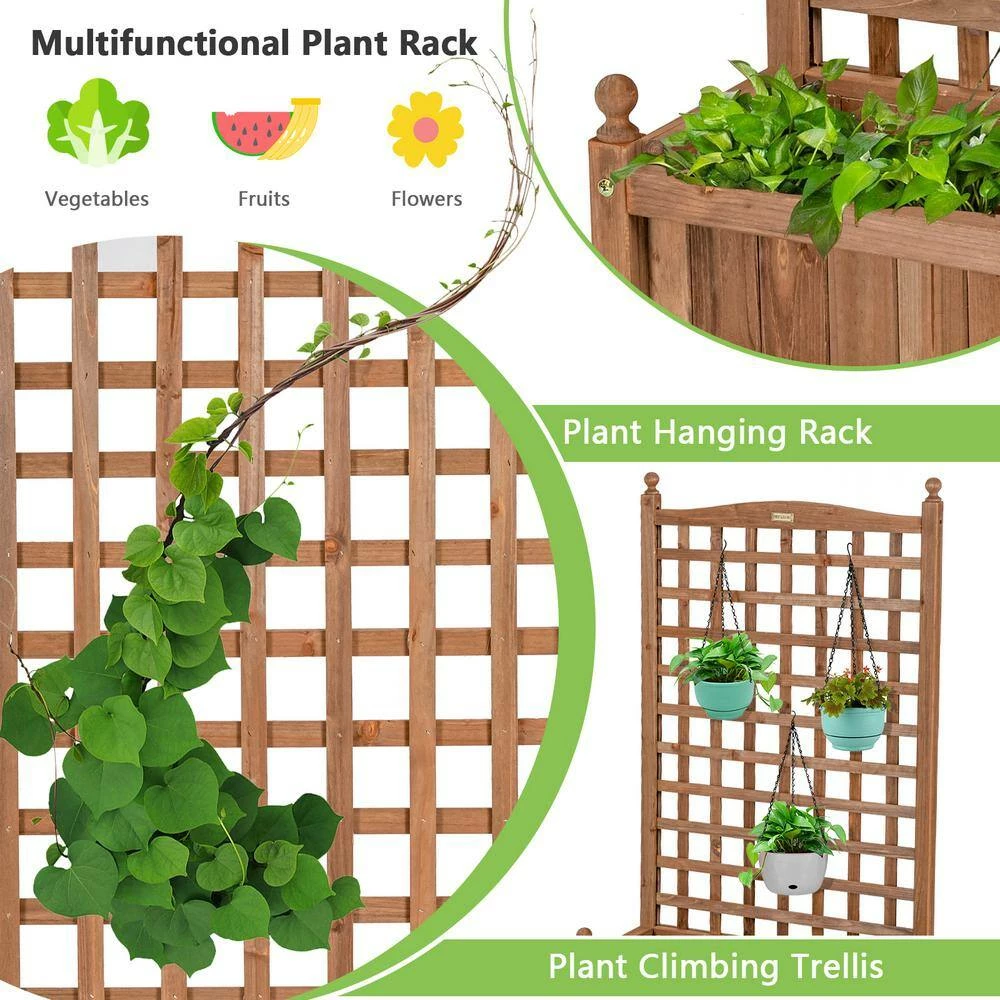 Our planters are made from high quality fir wood, 100% natural material. 6.5 in. D is enough to hold 66 lbs. of soil to grow fruits, flowers, or vegetables. The Planter trellis can be hung with plants up to 11 lbs. and can accommodate some vines. Nails are inserted into every joint to keep the trellis from becoming deformed. The water drainage hole at the bottom of the Planter bed give the plants a better environment to grow and prevent root rot. The lock wheel at the bottom allows the planter to move more easily and can be placed outdoors in sunny days or indoors in bad weather. If you are a gardening enthusiast, you must not miss this planter.